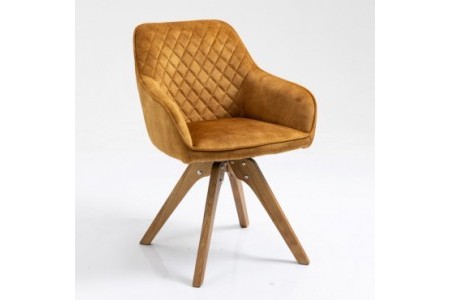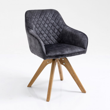 "Moderna blagovaonska stolica je debelo presvučena baršunastom tkaninom i dostupna je u nekoliko boja. Stolica ima pripijene rukonaslone i naslon za leđa koji je na stražnjoj strani ukrasno prošiven dijamantnim uzorkom. Postolje je izrađeno od punog jasenovog drveta, sa završnom obradom u prirodnoj boji drveta. Baza se spušta centralno prema van, od sredine gdje su noge pričvršćene za sjedalo. Stolica se može okretati za 180°. Maksimalna nosivost sjedalice je 120 kg. Boja: curcuma, svijetlo siva, tamno siva Dimenzija (cm): 59x60x86 Neto masa: 7,80 kg"