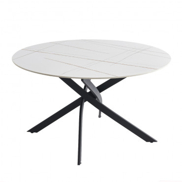 "Okrugli blagovaonski stol koji će vas impresionirati svojim modernim dizajnom. Ploča stola izrađena je od sinteriranog kamena s prekrasnim uzorkom bijelog mramora sa zlatnim žilama. Sinterirani kamen izrađen je od kombinacije nekoliko prirodnih kamenova u različitim bojama, s nekoliko prednosti u odnosu na običnu keramiku. Čvršći je od monoblok keramičkih ploča i ne razbija se tako lako. Prirodno je vodootporan u usporedbi s prirodnim granitnim pločama i ekološki prihvatljiviji od kemijski tretiranih kvarcnih ploča. Ploča stola ima promjer 133 cm i debljinu 1,2 cm. Postolje u elegantnom dizajnu, koje stolu daje moderan štih, izrađeno je od metalnih cijevi i plastificirano u crnoj boji. Maks. nosivost stola je 120 kg. Boja: bijeli mramor + zlato Dimenzije (cm): 133x76 Netto masa: 54,00 kg"
