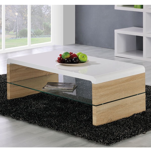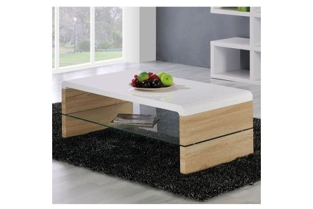 Elegantan klub stolić jednostavnih linija. Proizveden je u kombinaciji bijele boje visokog sjaja i sonoma hrasta. Prozirna polica od kaljenog stakla pru?a dodatan prostor za odlaganje.