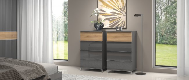 Sofisticiranost i toplina spavaće sobe Onyx proizlaze iz savršenog sklada u izboru materijala i oblika. Forma modernog dizajna i kombinacija tonova čine ambijent spavaće sobe inspirativnim. Detalji poput bešumnog zatvaranja i LED osvjetljenje dodatni uz lakirane površine sjajnim UV lakom pružaju dodatan dojam elegancije.
